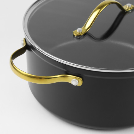 Garnek charakteryzuje się wysokością 13 cm bez pokrywy oraz 17 cm z pokrywą, a jego waga wynosi 2,11 kg, co sprawia, że jest lekki i wygodny w użytkowaniu. Elegancki design w czarnym kolorze ze złotymi uchwytami dodaje mu klasy i sprawia, że świetnie prezentuje się na każdym stole. Przezroczysta pokrywa z solidnym uchwytem umożliwia pełną kontrolę nad procesem gotowania.