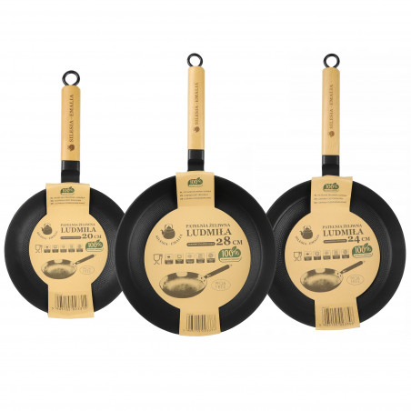 Zestaw patelni żeliwnych z drewnianą rączką LUDMIŁA 20cm + 24cm + 28cm