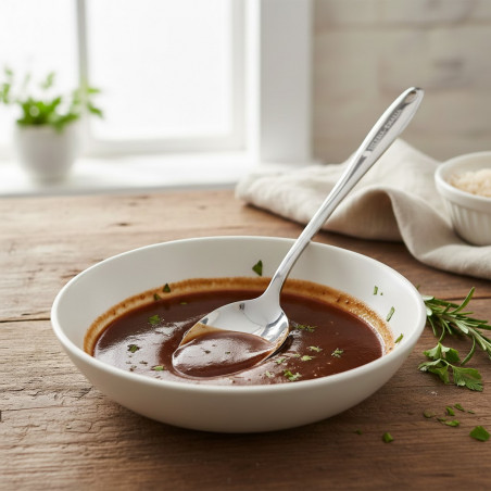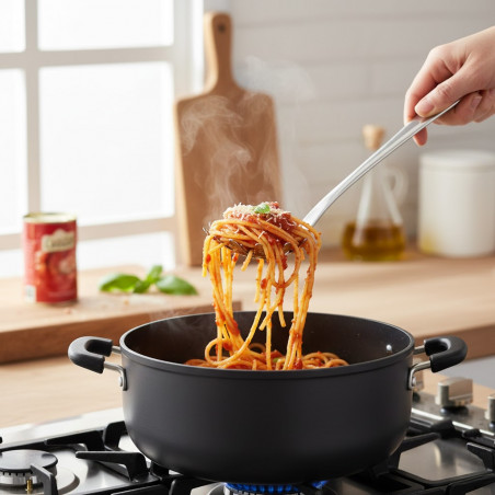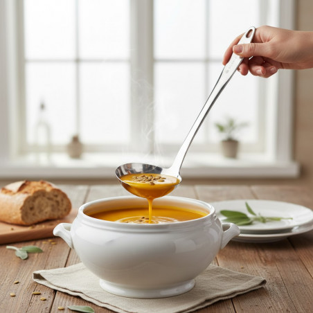 Wykonana w całości z jednego kawałka stali, co zapewnia wyjątkową trwałość, odporność na odkształcenia i łatwe czyszczenie. Ergonomiczny uchwyt gwarantuje pewny chwyt i wygodę użytkowania, a otwór na końcu pozwala na praktyczne zawieszenie łyżki.