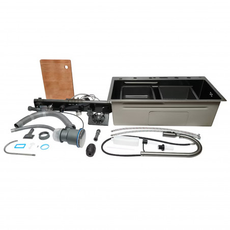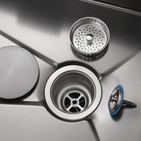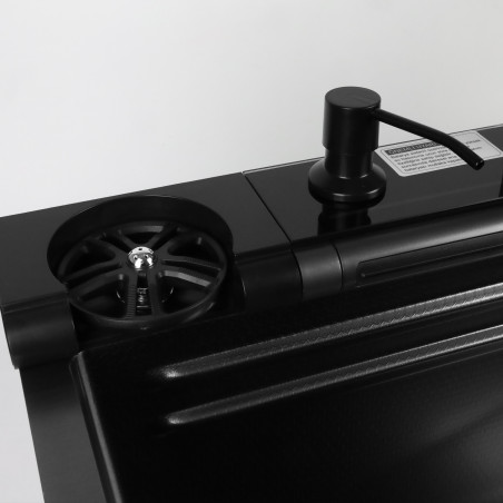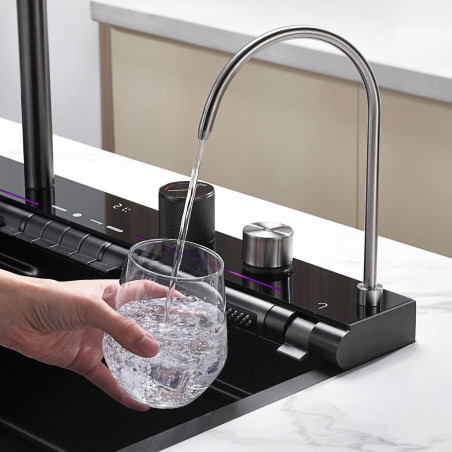 Dzięki suwanej półce zlew staje się jeszcze bardziej praktyczny, a myjka do szklanek ułatwia codzienne czynności kuchenne. Model ten został także wyposażony w kranik filtrujący wodę, gwarantujący dostęp do czystej wody pitnej, oraz dozownik na płyn, który pomaga utrzymać porządek wokół zlewu.