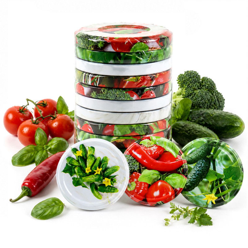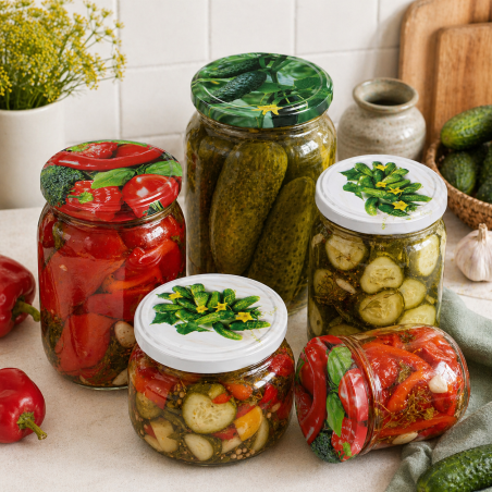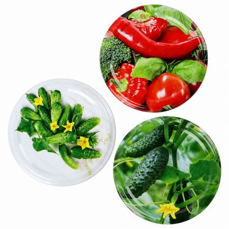 - Dekoracyjny wzór „Warzywa” - barwna grafika z motywem warzyw estetycznie podkreśla zawartość słoików i świetnie sprawdza się przy domowych przetworach.